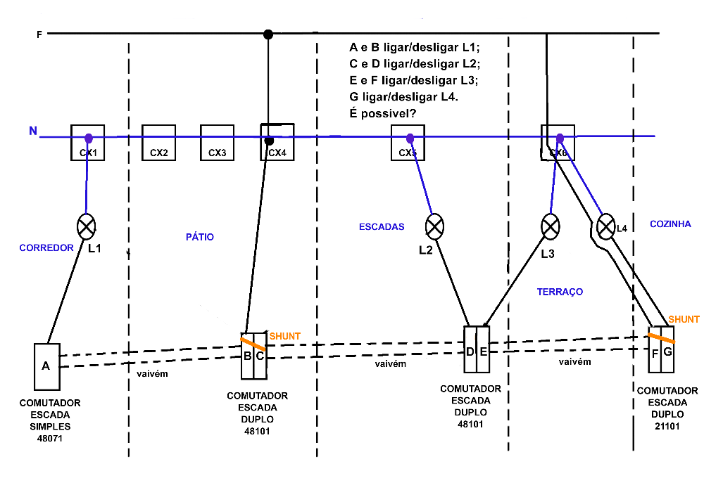 "Vaivém" são as duas linhas da comutação de escada, entre comutadores (as linhas tracejado). As linhas "a cheio" preto representam a Fase e as linhas que ligam às lâmpadas! O "Corredor", "Pátio", "Escadas", e "Terraço" é no exterior, embora com cobertura, daí usar os comutadores 48071 e 48101, na "Cozinha", uso o comutador 21101. O SHUNT em F/G não estava no esquema por esquecimento!