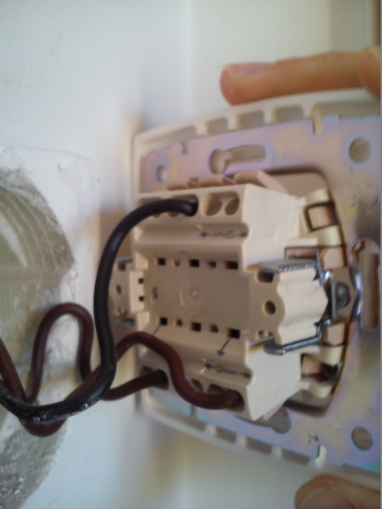 Então tens de trocar o segundo porque o que tens ai é um comutador de lustre. E tens de trocar para um comutador de escada de um tecla e assim fica tudo a funcionar.
