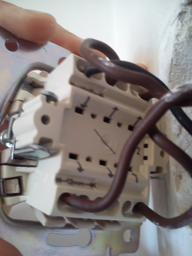 Identifica os tres fios que vem do outro comutador (2 castanhos e 1 preto) e liga-os da mesma maneira. o preto na seta de saida no lado oposto as duas entradas onde ligas os castanhos.