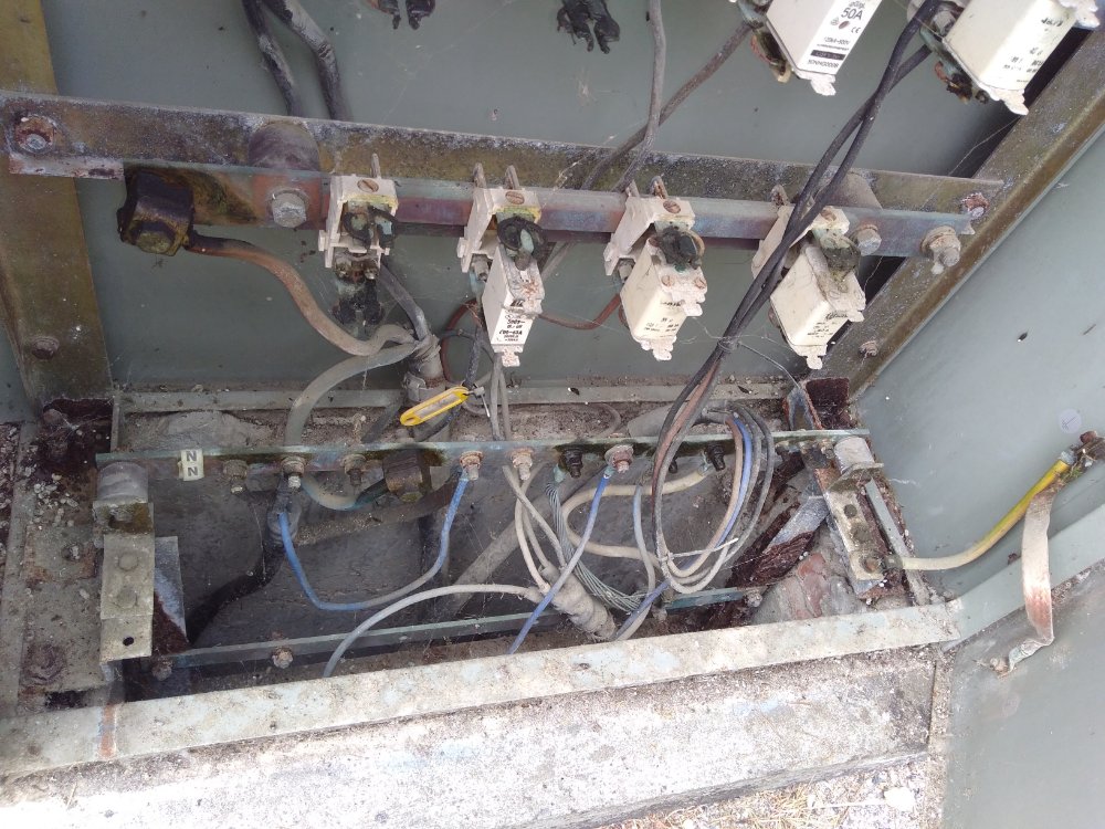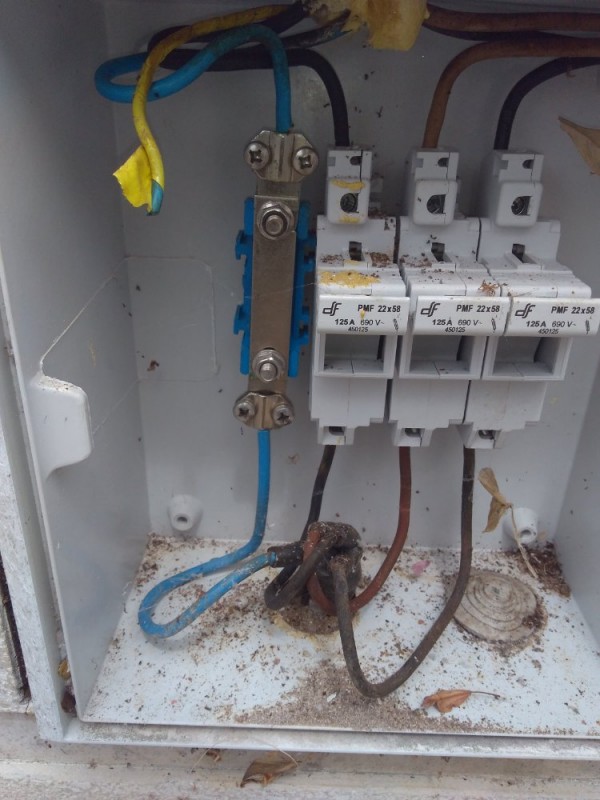 Pronto agora foi.... As 2 imagens iguais e antes de de chegar na casa... E a outra foto dos fusíveis onde o terra está cortado. Sem estar ligado em nada.ja é quase no relógio da EDP. Eu acho que está desligado pq os cabos são de 10 mm é só o terra é 6 mm o que acham... Faço um aterramento com astes tbm? Ou só passo um cabo 10 mm do terra e peço pra ligar?