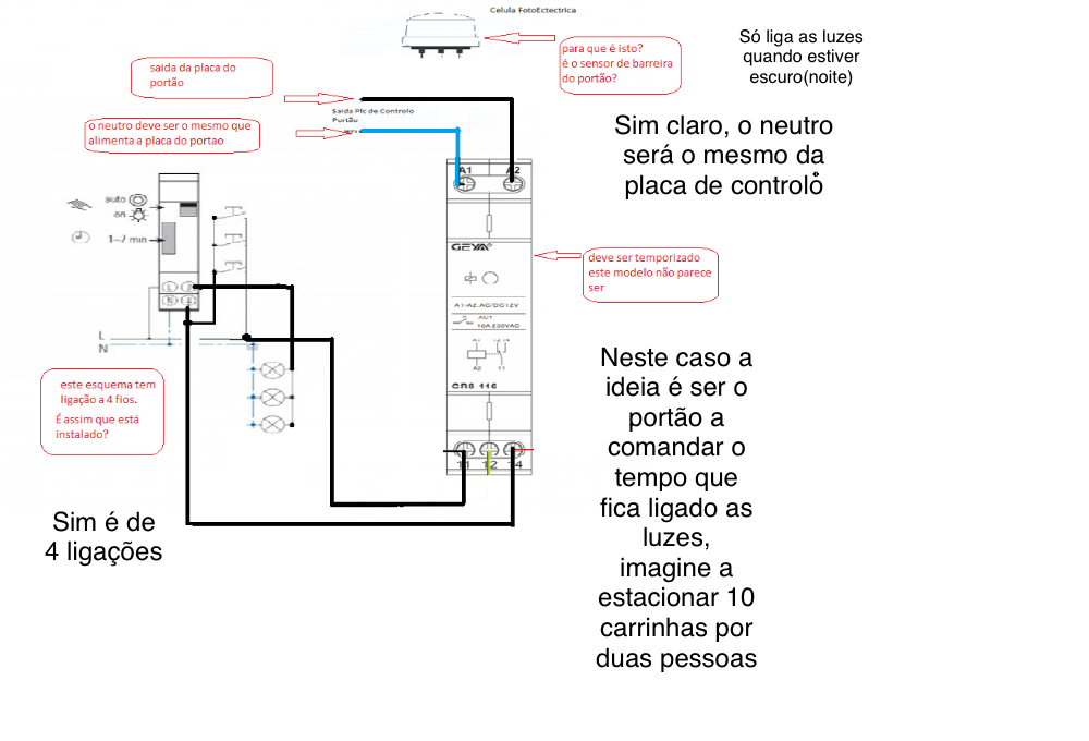 Viva, no esquema que vocês fez, colocou a saída do portão em paralelo com os botões de pressão, imagine por ventura o portão fica horas aberto( que as vezes acontece em manutenção das carrinhas) o relê estaria sempre actuar, levando avaria ao automático de escada certo?! Neste esquema que fez terá que ser mesmo o relê com temporizador.justme Escreveu: 02 mai 2020, 13:35 Boas,