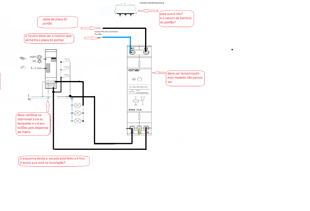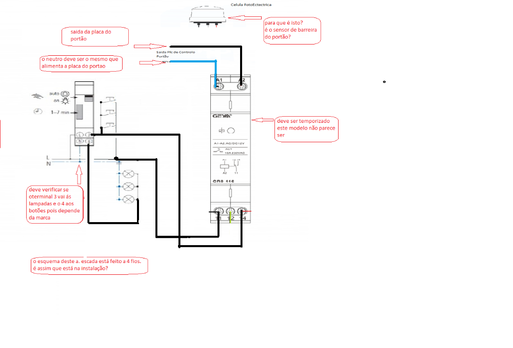 Viva, no esquema que vocês fez, colocou a saída do portão em paralelo com os botões de pressão, imagine por ventura o portão fica horas aberto( que as vezes acontece em manutenção das carrinhas) o relê estaria sempre actuar, levando avaria ao automático de escada certo?! Neste esquema que fez terá que ser mesmo o relê com temporizador.justme Escreveu: 02 mai 2020, 13:35 Boas,