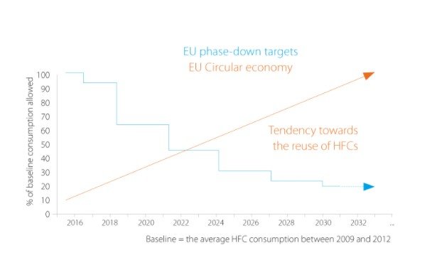 Os objetivos de abandono progressivo são expressos em equivalentes a CO2 [= kg x GWP] e não são específicos dos fluidos frigorigéneos. A legislação não proíbe por completo qualquer fluido frigorigéneo específico. Isto significa que não existem dúvidas de que os fluidos frigorigéneos estarão disponíveis durante a vida útil do equipamento (por exemplo, R-410A para sistemas DX).