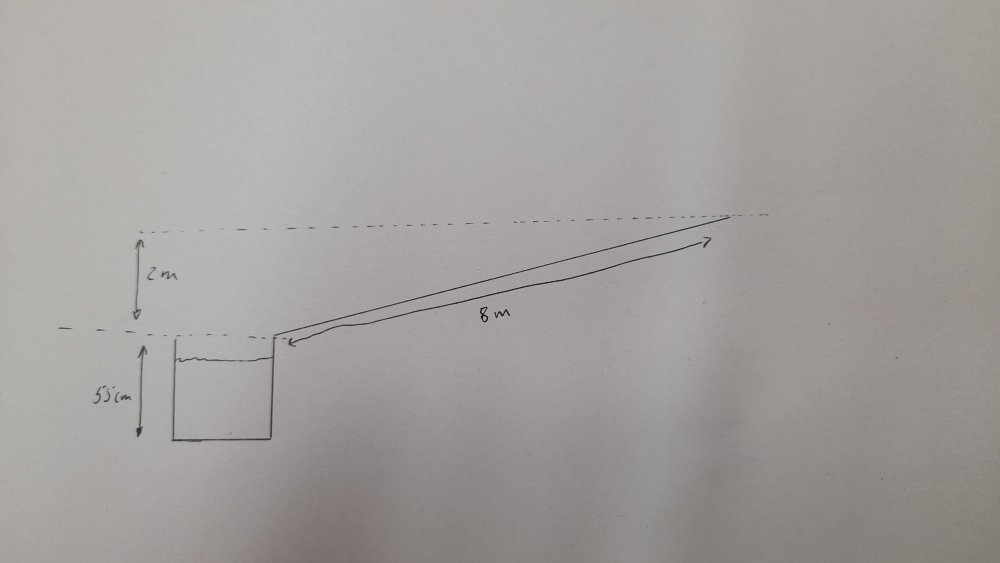 O comprimento do tubo é de 8 metros mas o desnível entre a caixa de água e o local para onde a água vai ser bombada é de 2,5 metros.