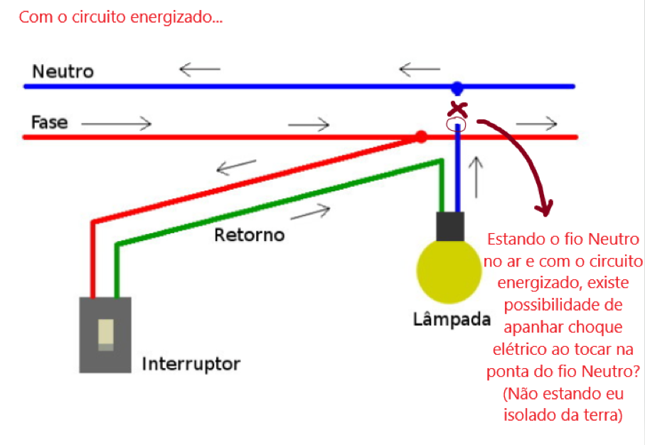 Efectivamente e como sabem o Neutro não dá “choque” porque está a um potencial zero juntamente com a terra ,ou seja está ligado na estrela do gerador que como sabem o potencial é zero ,leis de khirkoff. No entanto o que realmente vai poder dar a fuga ou o dito “choque” será o fio de retorno esse sim ao ser interrompido ,que na figura é o que está a acontecer o neutro foi interrompido e transformou-se em retorno com o interruptor ainda ligado onde continua ater a passagem de corrente ,mas agora sem o Neutro.