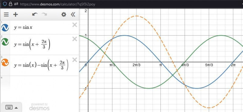 Coloquei no link https://www.desmos.com/calculator/7q5f3i2poy (e que também coloquei em anexo) a representação de 2 fases , e depois a diferença entre as fases.