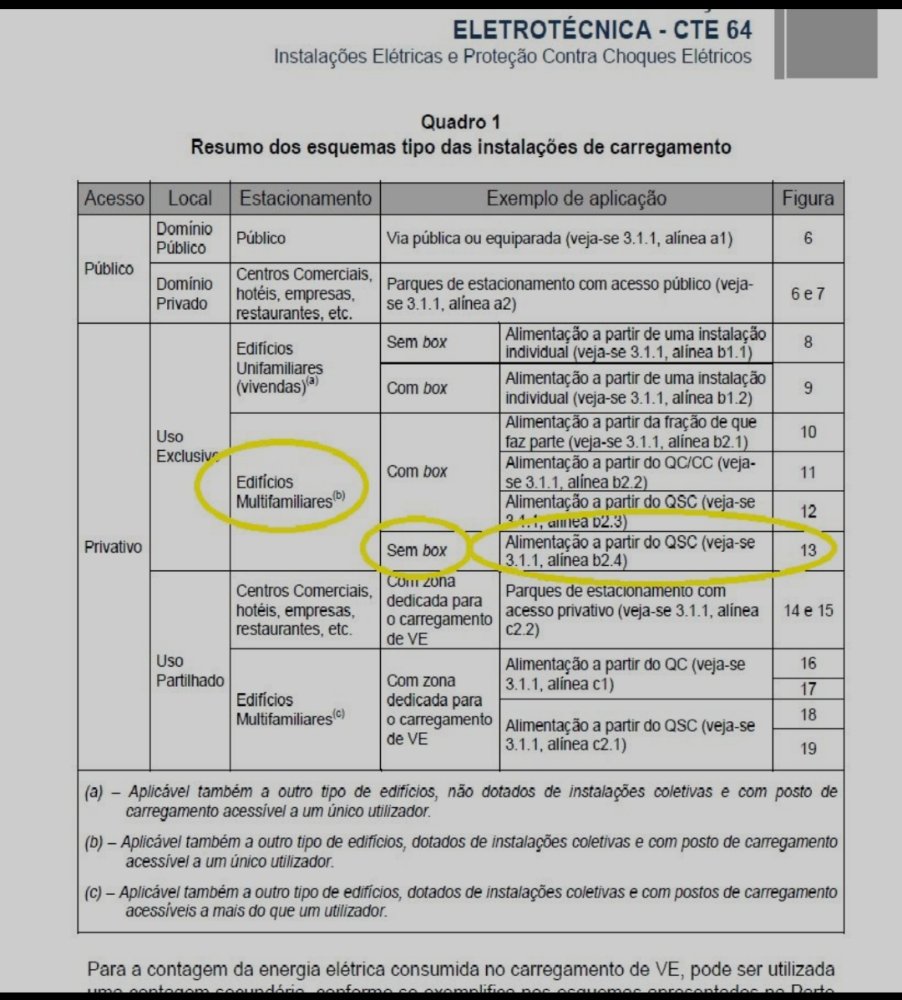 Lê o GUIA TÉCNICO DAS INSTALAÇÕES ELÉTRICAS PARA ANotreDame Escreveu: 13 mar 2022, 23:43E isso é legal?maxxis Escreveu: 13 mar 2022, 23:31Caso o cliente não tenha arrecadação junto ao seu lugar de estacionamento, com energia a partir da sua habitação (e assim poder fazer a ligação ao seu apartamento), a solução passa por fazer a ligação ao quadro de serviços comuns, carece de autorização e custos a cargo do cliente. O que se tem feito é colocar um contador (tipo modular, calha DIN) e assim fazer o acerto dos kw/h com o condomínio. Não é aconselhável nem seguro a instalação a partir da fração, além de que seria bem mais dispendioso. Importante usar diferencial tipo A e cabo rz1-k fxg (verde).NotreDame Escreveu: 13 mar 2022, 22:16 Boa tarde!