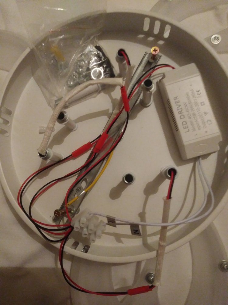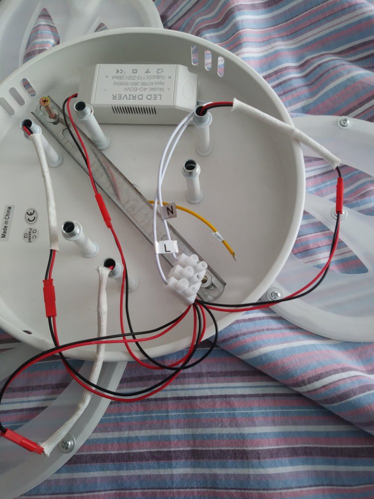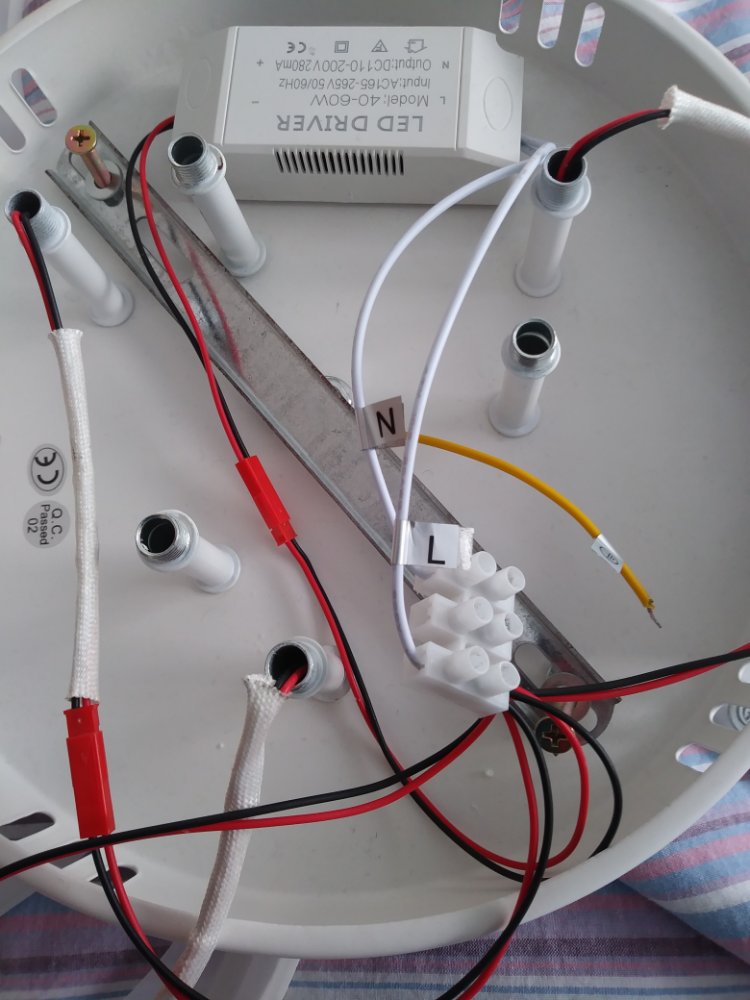 boas.porque não pediu a alguem que a ajudasse?se ligou assim como está possivelmente já queimou o candieiro,pois os fios vermelhos sáo separados dos pretos e não juntos e os fios brancos sáo os que ligam aos do teto, e o amarelo é o fio de terra que liga com o amarelo de teto.agora já deve ser tarde.cump