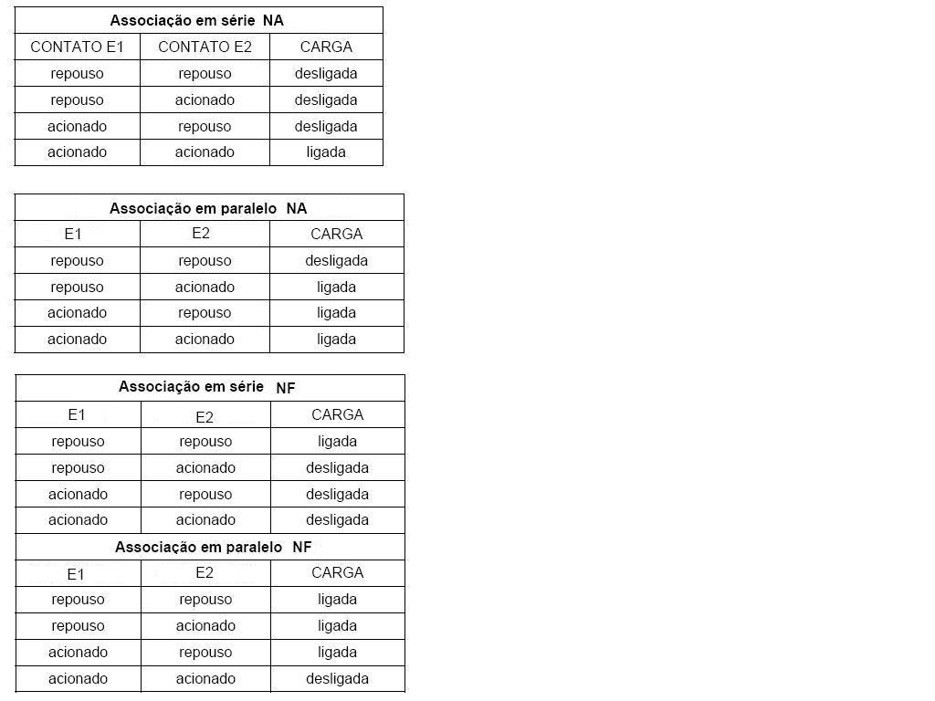 Quando se fala em associação de contactos é normal daí construírmos uma tabela contendo todas as combinações possíveis entre os contactos, denominada de “Tabela Verdade”. Note-se que na combinação em série a carga estará accionada apenas quando os dois contactos estiverem accionados e por isso é denominada de “função E”. Já na combinação em paralelo qualquer um dos contactos ligados energiza a carga e por isso é denominada de “função OU”.