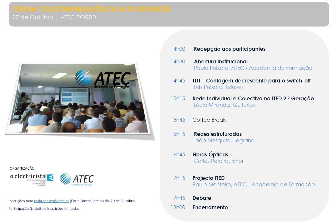 A ATEC irá realizar no próximo dia 27 de Outubro pelas 14 horas nas instalações do Porto o Fórum Telecomunicações de Alta Definição. Este evento terá como objectivo analisar as telecomunicações em diferentes perspectivas que, após as alterações impostas pelo novo regulamento ITED, pela criação das regras e orientações para o ITUR e a chegada da TDT, caminham a passos largos para as Telecomunicações de Alta Definição!