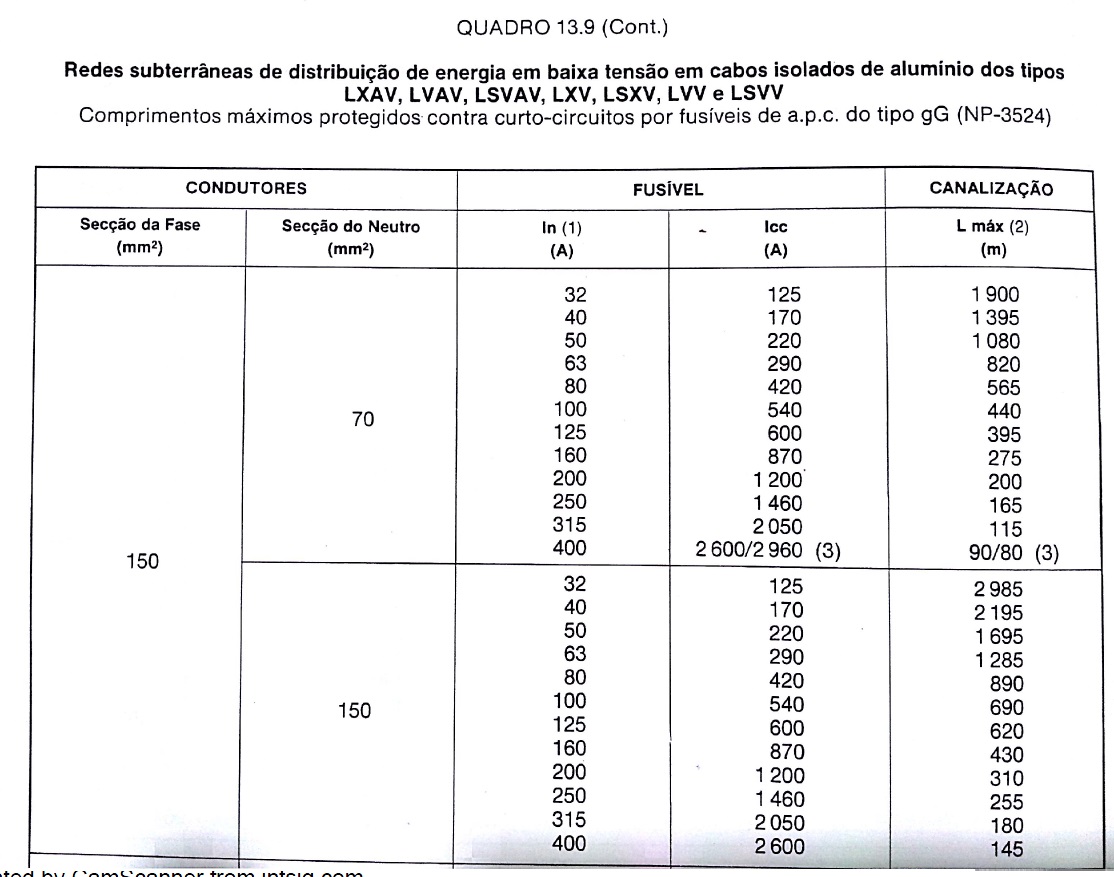 Se essa tabela for válida para s=150 mm^2--------L=165 m Para S=2x150mm^2 seria Lmax=165x2= 320 m <<454 m