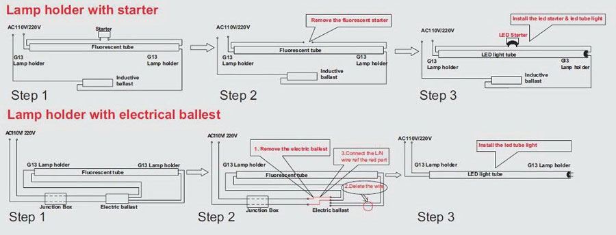 Aqui fica um imagem onde explica por passos como deves fazer a tua alteração com balastro electrónico.