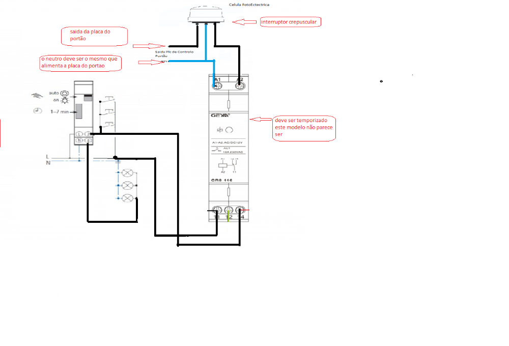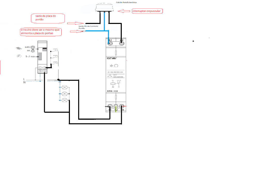 Mas se reparar estão separados, por isso é que tem dois contactos 1NF onde fica ligado o circuito de iluminação, e no contacto 1NA está o circuito do portão, não se misturam, se alimentar a bobine do relê passa abrir o primeiro contacto e fecha o segundo.