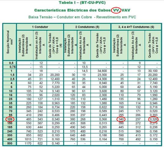 A) Falas em cabo XV e apresentas valores de tabela em relação ao cabo VV