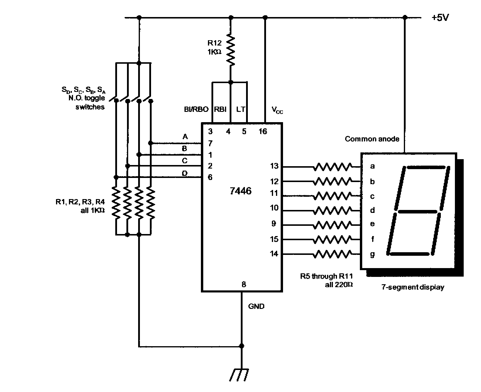 Pelo que percebi, ele quer converter um sinal eléctrico codificado BCD, num sinal luminoso 7 segmentos, que apresenta digitos de 0 a 9.