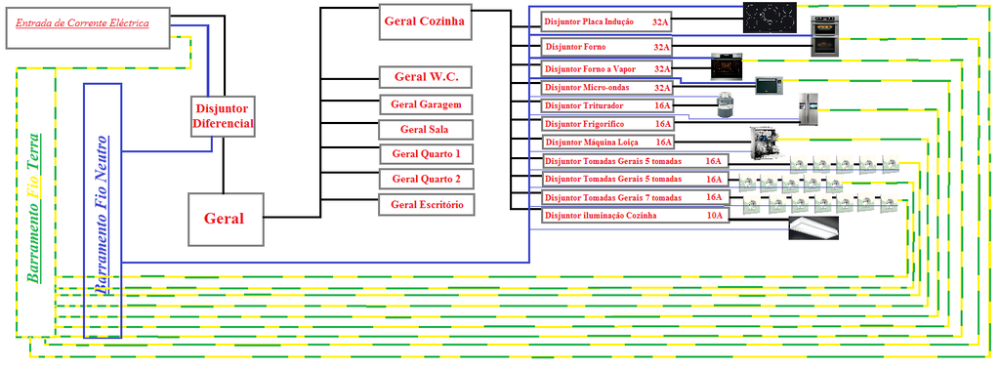 Os restantes electrodomésticos; Máquina lavar louça; Frigorifico exaustor e triturador de bancada também directo ao quadro ligados com fio de 4mm protegido com disjuntor de 25A