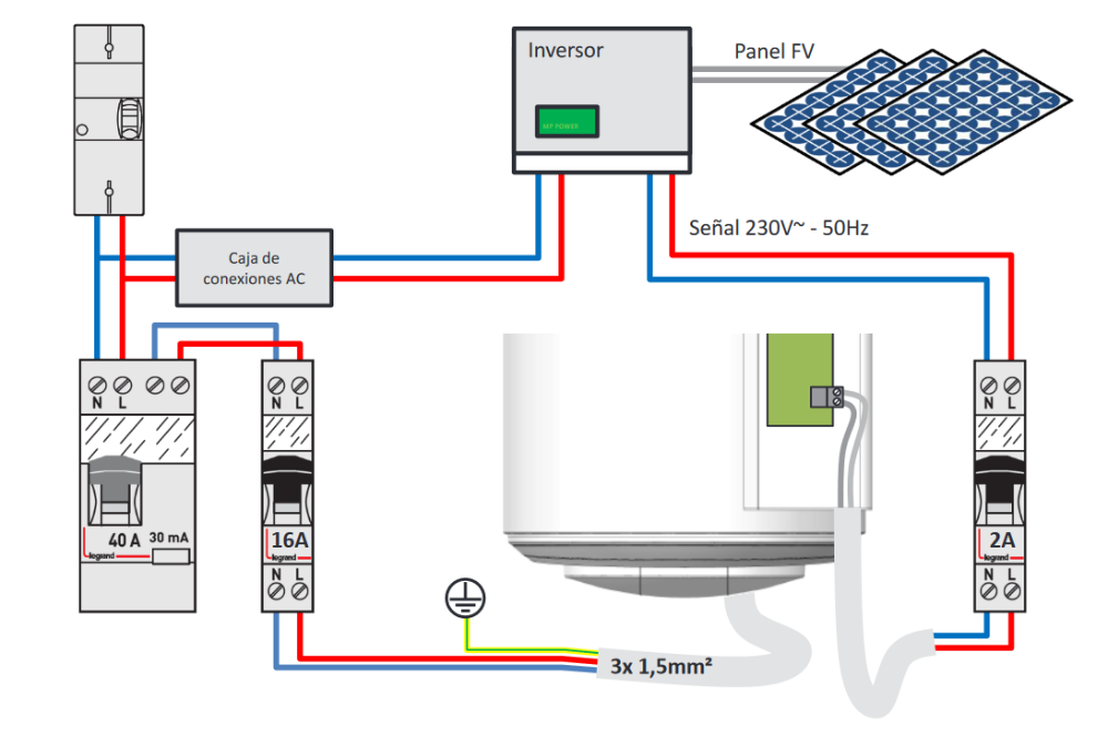 Se o seu inversor tem uma saída a 230 Volt (que indique produção "excessiva") pode ligar como indica o diagrama, com a proteção por disjuntor indicada, mas se não tem esse tipo de saída disponível no inversor terá de arranjar outra solução, como a de intercalar um relé, por exemplo.