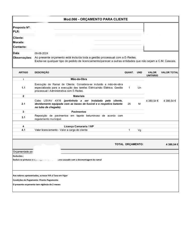 O meu engenheiro pediu um orçamento da ligação do ramal subterrâneo de um cabo LSVAV de 25 M para uma moradia unifamiliar no concelho de cascais , a distância entre o poste e a portinhola são 10 metros.