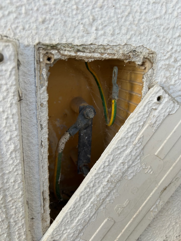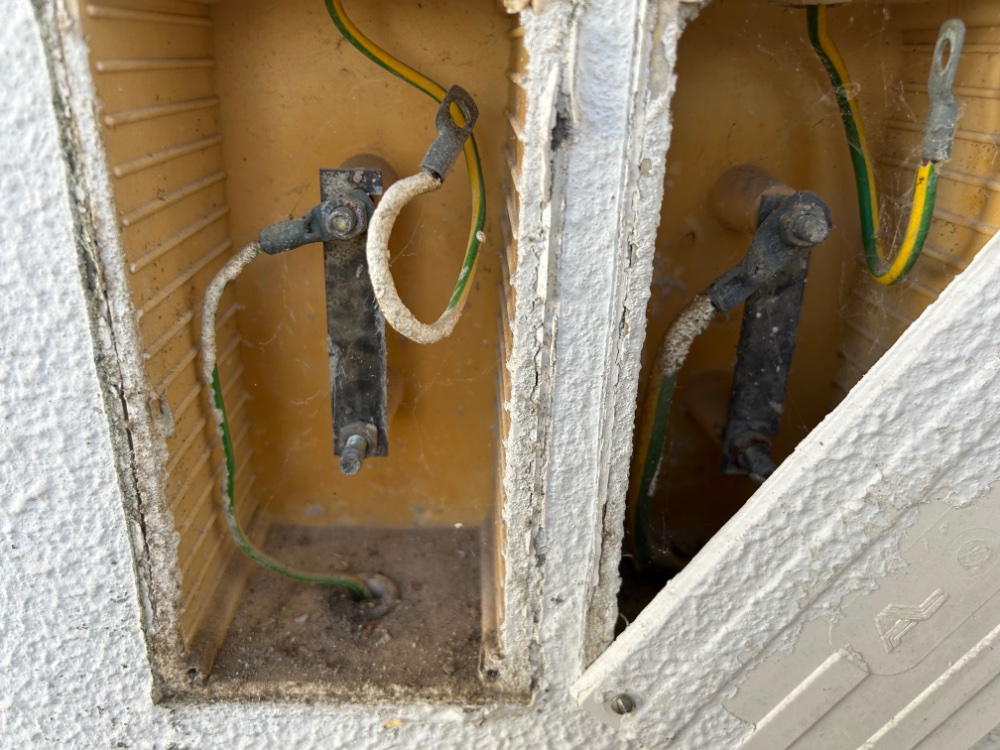 Entretanto como ando com ideias de colocar uma tomada CEE de 16A no exterior e estava a pensar qual seria a melhor maneira de passar o cabo para dentro de casa para não andar a fazer buracos reparo numas caixas e abro para ver se poderia ser uma opção e vejo que os cabos estão desligados.