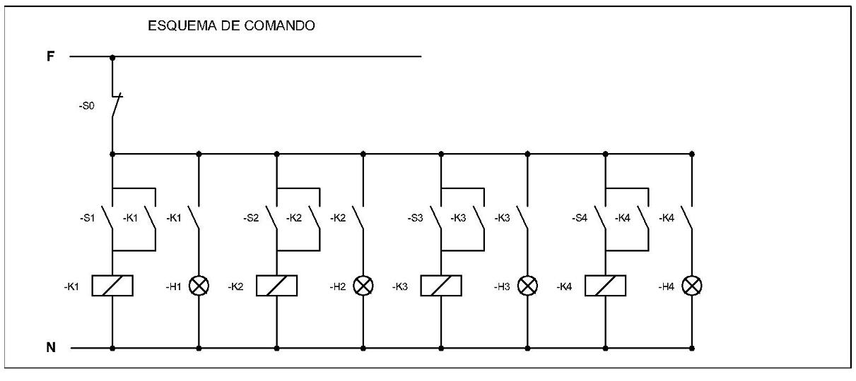 O botão S0 desliga todas as lâmpadas, e os S1, S2, S3 e S4 comandam cada uma individualmente. K1, K2, K3, e K4 são os relés (com contactos auxiliares, que se podem ver no esquema). H1, H2, H3 e H4 são as lâmpadas.