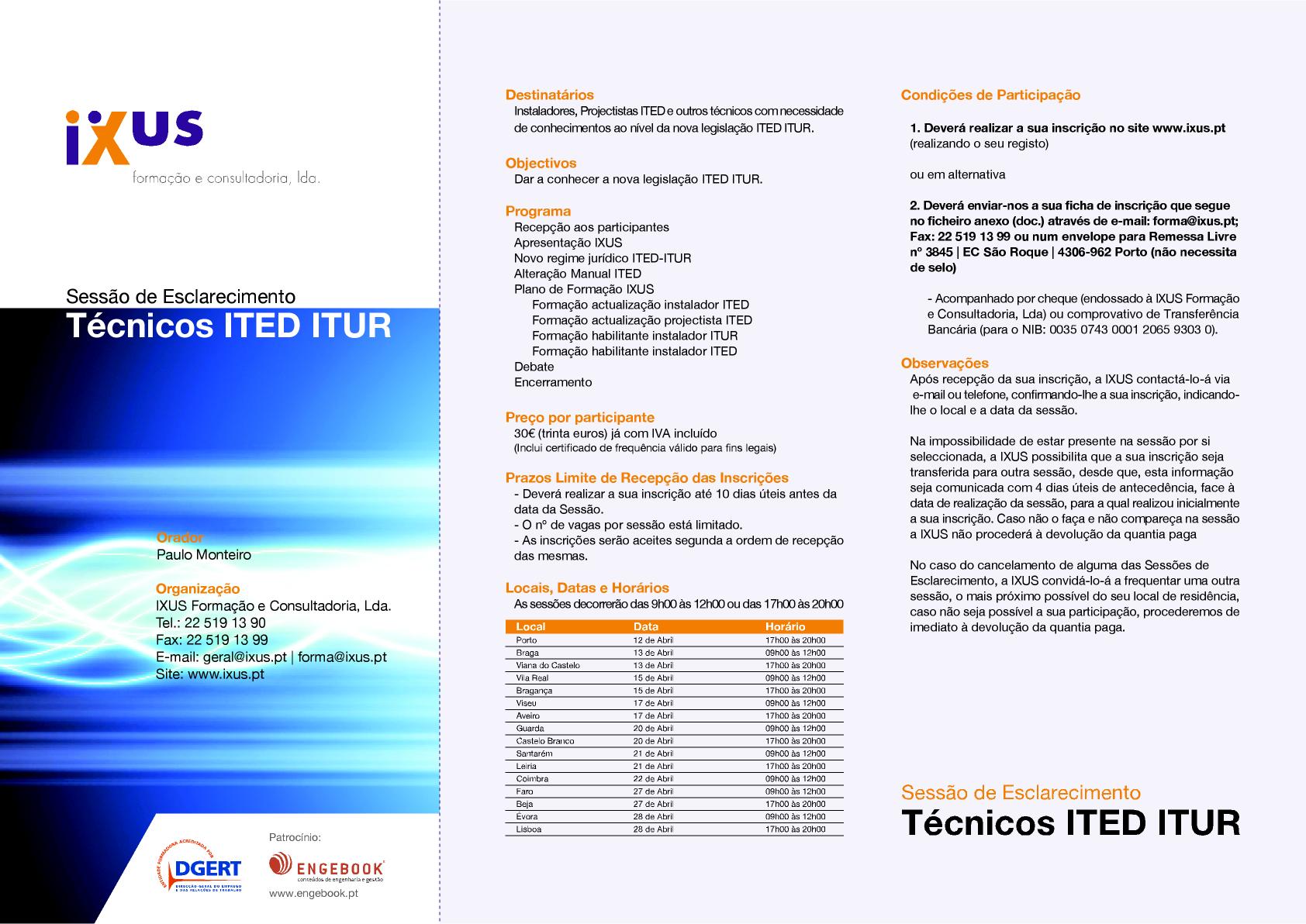 Na sequência da entrada em vigor do novo regime jurídico das ITED-ITUR, introduzido pelo Decreto-Lei n.º 123/2009, de 21 de Maio, bem como da aprovação dos novos projectos de normas técnicas (Manuais ITED e ÌTUR), a IXUS Formação e Consultadoria vai realizar um ciclo de sessões de esclarecimento, com o objectivo de promover o debate e o esclarecimento de questões.