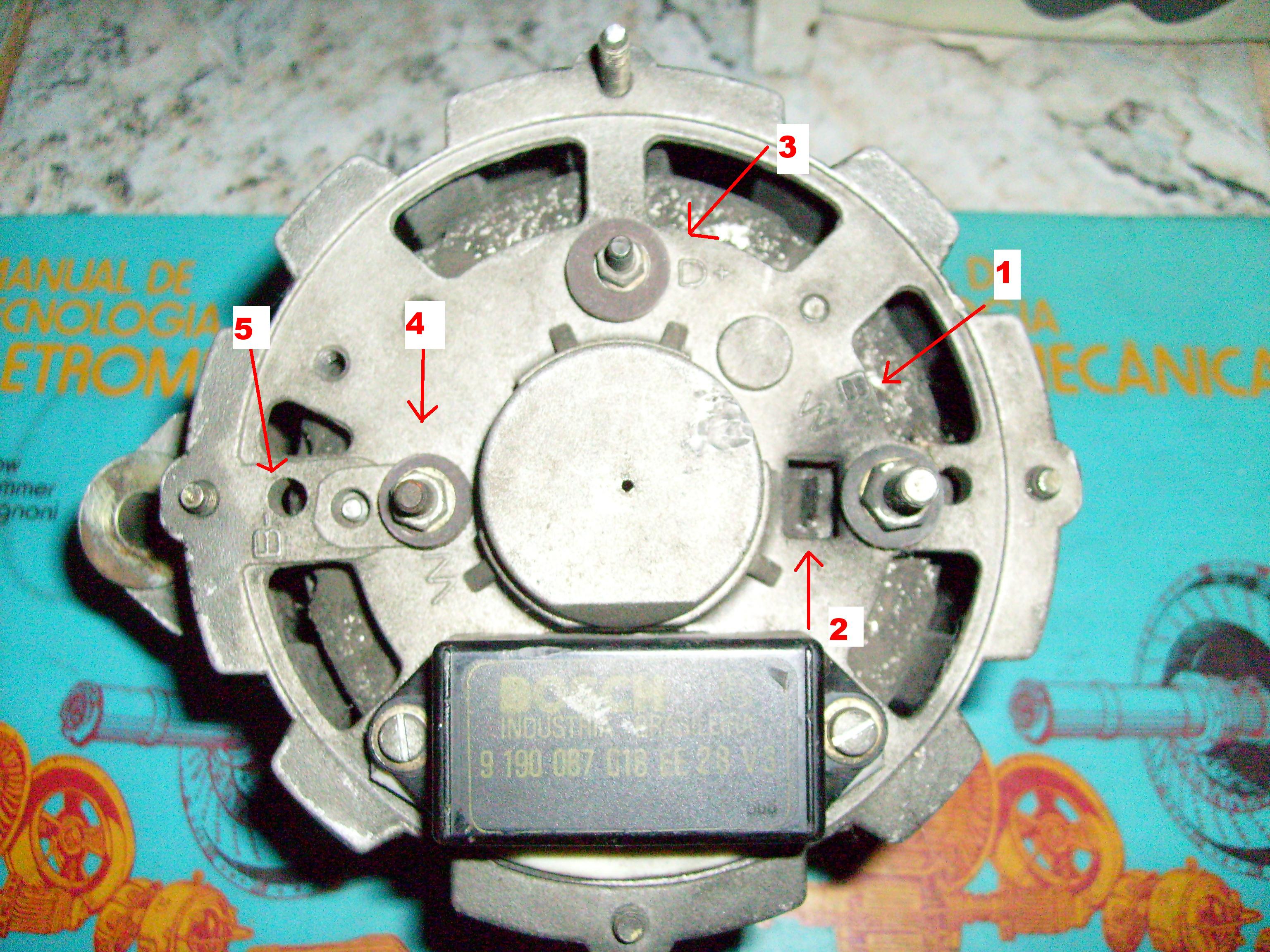 Para montar o projeto, uma das primeiras coisas a fazer, mesmo antes de montar o circuito é é desmontar o alternador. Depois que estiver com ele aberto facilmente vai identificar tudo. o + é a saída de positivo do alternador (o parafuso mais grosso e que está isolado, e normalmente indicado com +B), o - é o negativo (qualquer ponto da carcaça), o AC é qualquer uma das três fases do bobinamento, e os dois últimos, como já está dito, são os fios das duas escovas (que vão para o induzido).