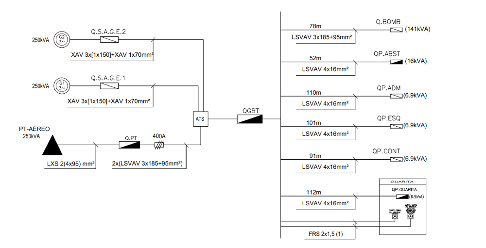 Pretendo colocar no quadro do PT apenas um disjuntor. Para alimentar o QGBT.arcturus Escreveu: 01 fev 2021, 13:11 Certo. Deves representar no esquema, o quadro do PT e a respectiva protecção do cabo (provavelmente fusiveis de 250 A) No quadro do PT, ocupas apenas um dos triblocos de saída, ficando os restantes como reserva