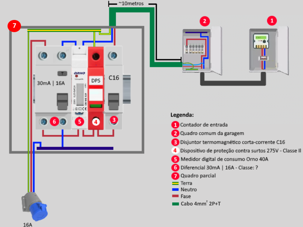 - O cabo verde representado desde o quadro da garagem (2) até ao quadro parcial (7) será um cabo 2P+T de 4mm ligado à diretamente à alimentação do quadro da garagem