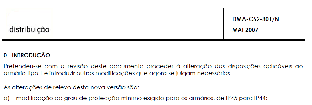 "Os armários de distribuição deverão ter índices de protecção mínimos IP45 e IK10 de acordo com a Norma Portuguesa NP EN 60529 e Norma EN 50102 respectivamente (NP EN 60529 – Graus de Protecção Assegurados pelos Invólucros – Código IP; EN 50102 – Graus de protecção Assegurados pelos Invólucros contra os Impactos Mecânicos – Código IK)."