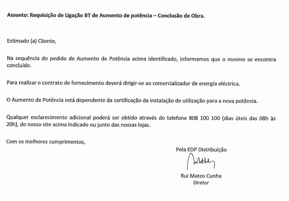 Aliás a ultima carta da edp mencionava que o processo de aumento de potência se encontra concluído (não foi nada do que pedi - nunca teve contador) - anexo cópia da carta.