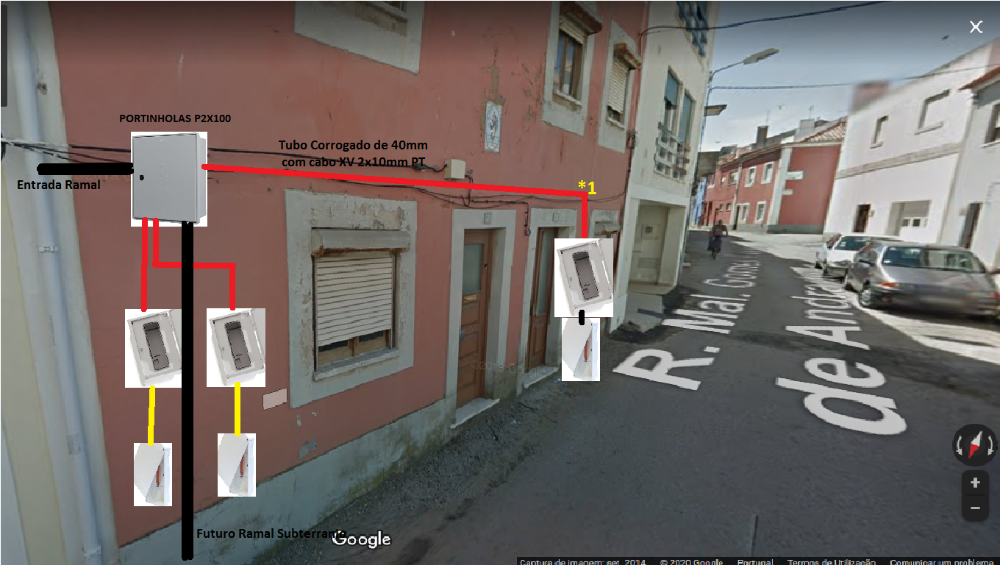 O normal é o cabo baixar até ao pavimento, andar em vala e subir à portinhola, e nunca derivar para a outra portinhola da forma como tem desenhado.