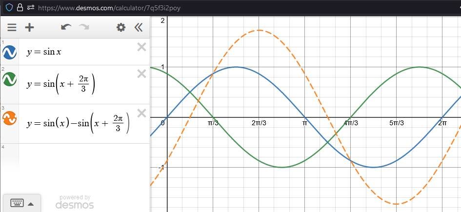 Coloquei no link https://www.desmos.com/calculator/7q5f3i2poy (e que também coloquei em anexo) a representação de 2 fases , e depois a diferença entre as fases.