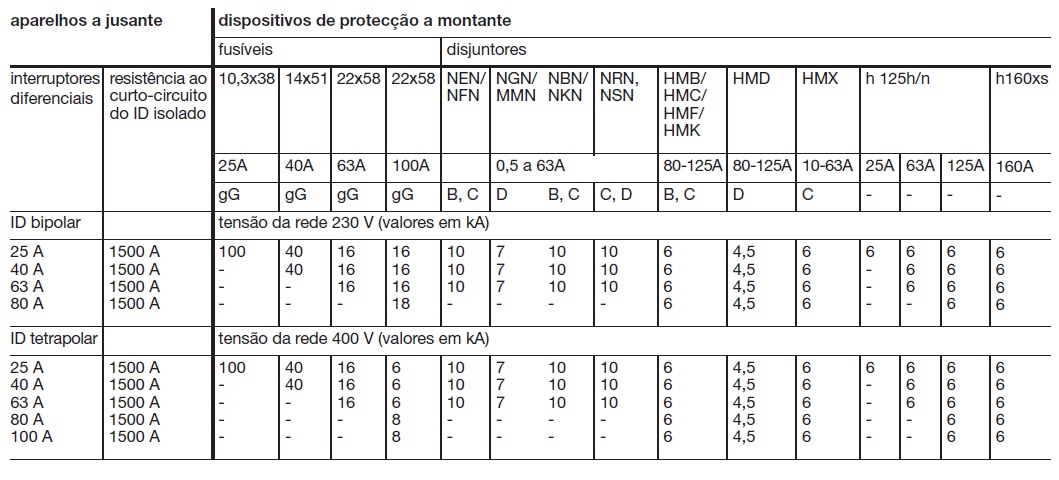 - o poder de corte da associação ID com fusíveis ou disjuntores.
