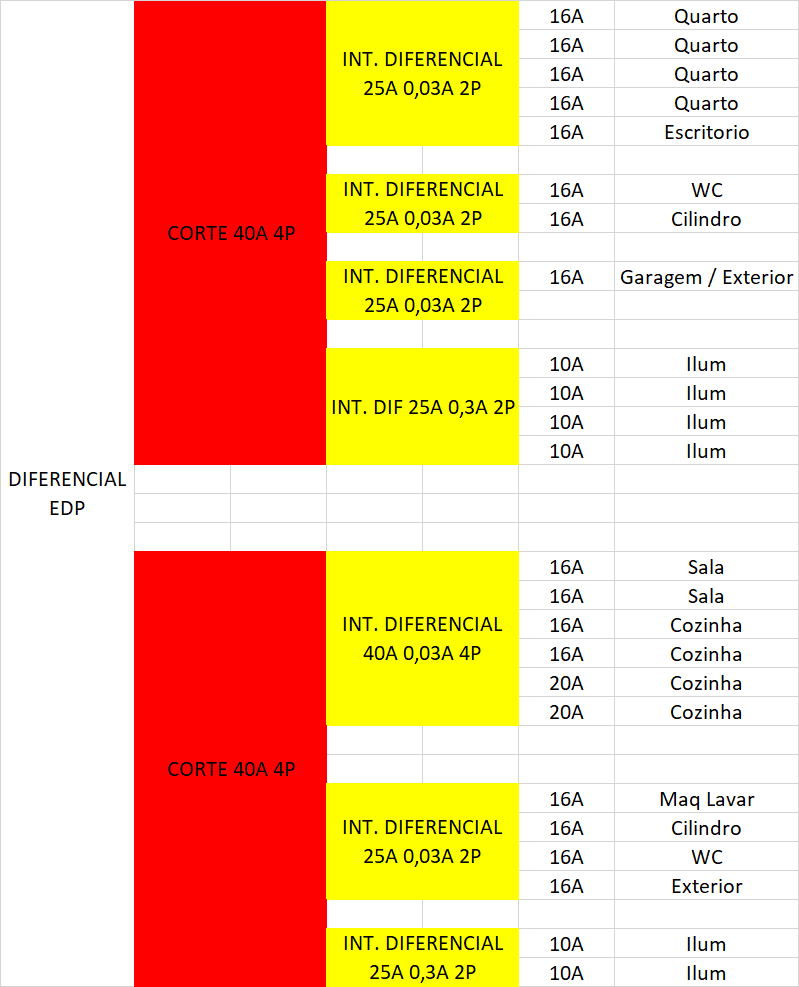 No primeiro piso tem a ligação a EDP e deste quatro, no diferencial ligam alguns disjuntores e tem uma ligação para o quadro do piso de baixo conforme a figura.