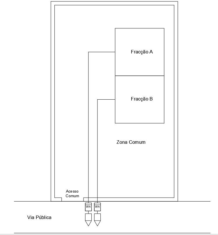 Pediram-me para tratar de um processo (projecto) de um edifício abandonado que recebe actualmente um ramal com respectiva portinhola e caixa de contador mas que será alterada a sua composição para passarem a ser duas fracções residenciais sem partes comuns (a entrada de portão é a mesma mas pretendem que fique de abertura manual para não implicar serviços comuns). Existe ainda um anexo que será dividido em duas garagens independentes (uma para cada fracção).