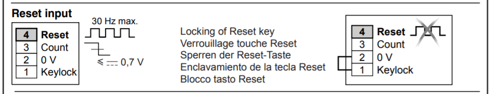 O counter tem 4 portas, 1-keylock, 2-0v, 3- count, 4-reset.