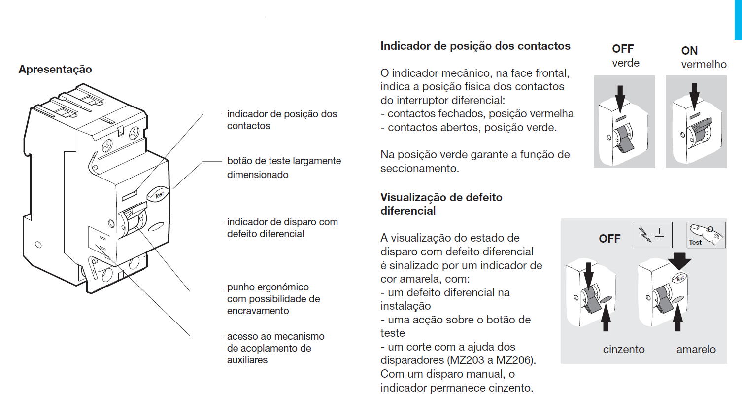 Mais segurança : Após um defeito diferencial o interruptor abre. Em caso do aparelho verificar, atravès de um teste, que o defeito está extinto o interruptor rearma. automáticamente.