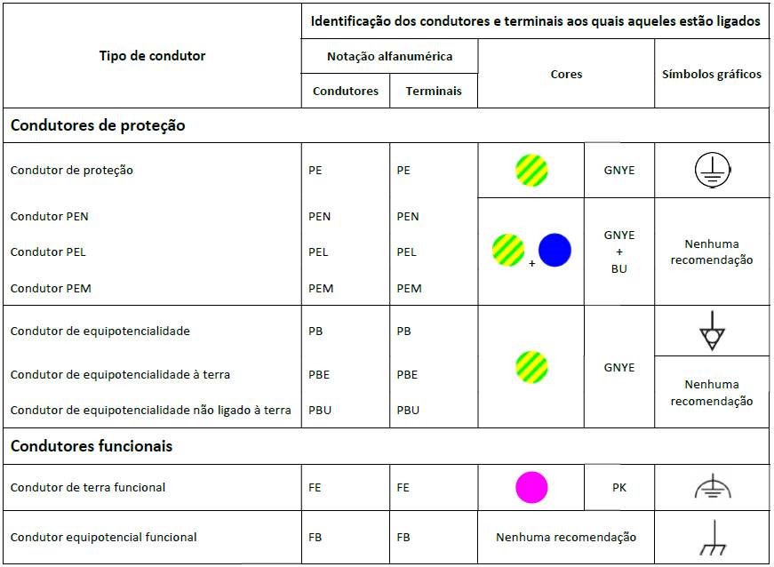 Para qualquer uma destras situações, este condutor deve ser marcado com anéis ou com marcas de dupla coloração verde-amarela, colocadas nas extremidades e em todo o percurso à vista do condutor. Além disso, se um mesmo cabo incluir dois condutores neutros (por exemplo, dois circuitos monofásicos servidos pelo mesmo cabo), é admissível marcar um condutor de coloração igual à dos condutores de fase com anéis ou com marcas de cor azul-clara.