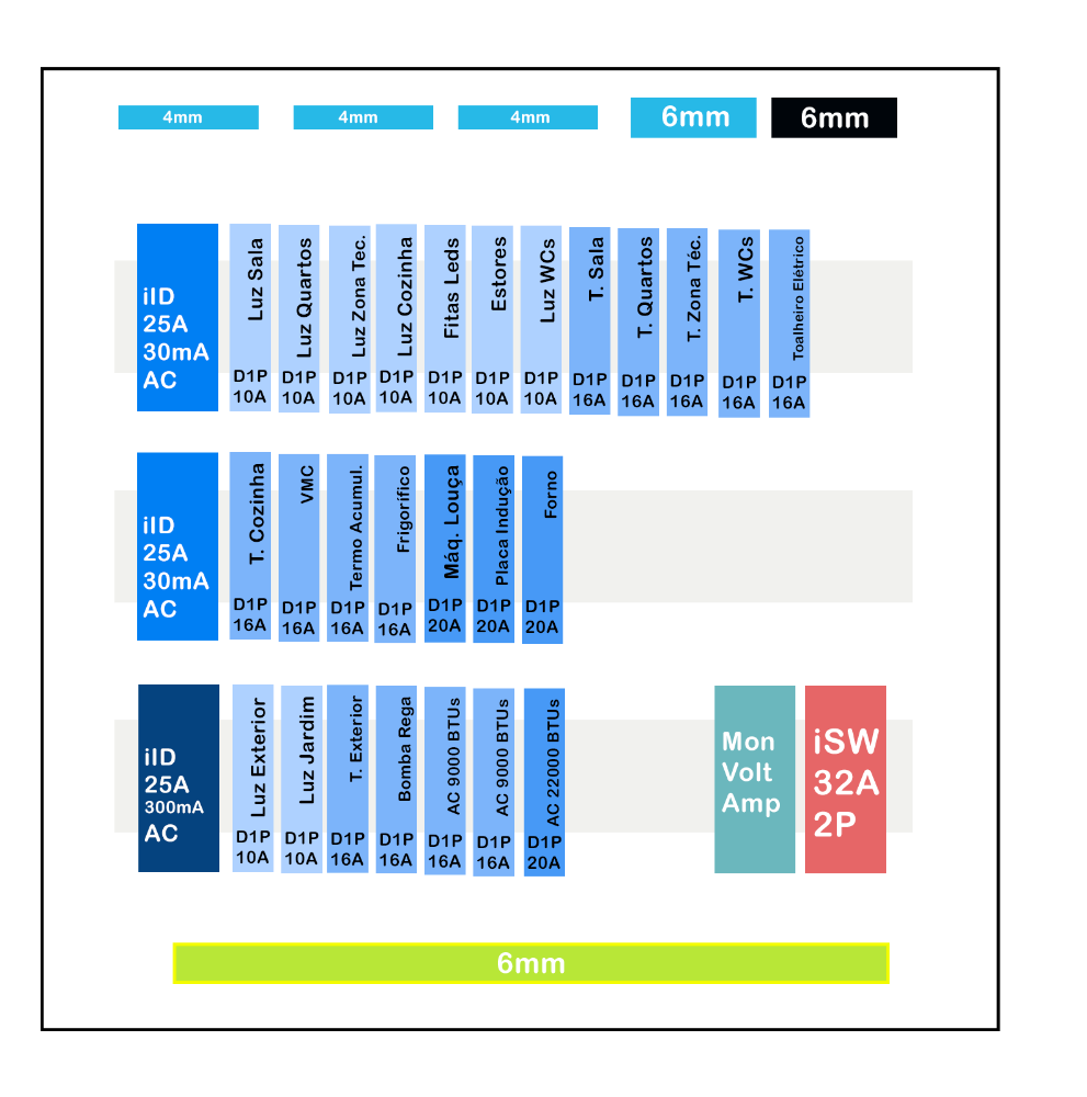 2. Dividi o quadro com 3 iIDs (2 de alta sensibilidade e 1 de baixa sensibilidade). A lógica foi balancear a carga nos de alta sensibilidade. Sei que não é obrigatório os 30mA nos quartos, sala, etc. mas não vou perder com isso. Coloquei o de baixa sensibilidade para equipamentos e tomadas exteriores.